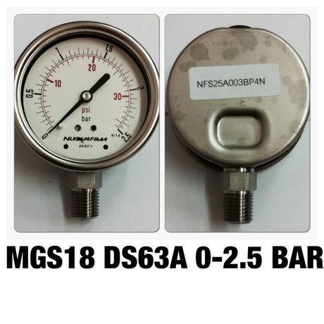 NUOVA FIMA Pressure Gauges 2.5 นิ้ว 0-2.5 BAR (30PSI) ออกล่าง เกลียว 1/4" NPT สแตนเลส