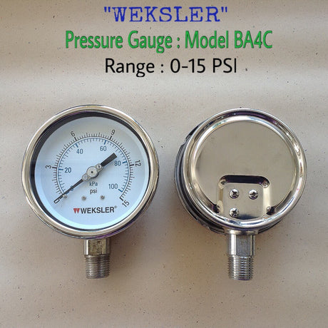 WEKSLER Pressure Gauges "WEKSLER" 4 นิ้ว 0-100KPA/0-15PSI ออกล่าง 1/2" สแตนเลส NPT