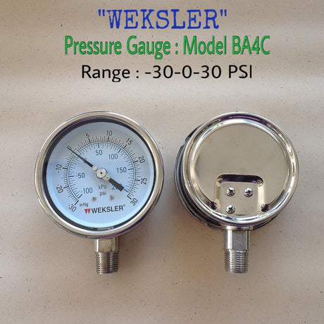 WEKSLER Pressure Gauges "WEKSLER" 4 นิ้ว -100-200KPA/-30-30PSI ออกล่าง 1/2" สแตนเลส NPT