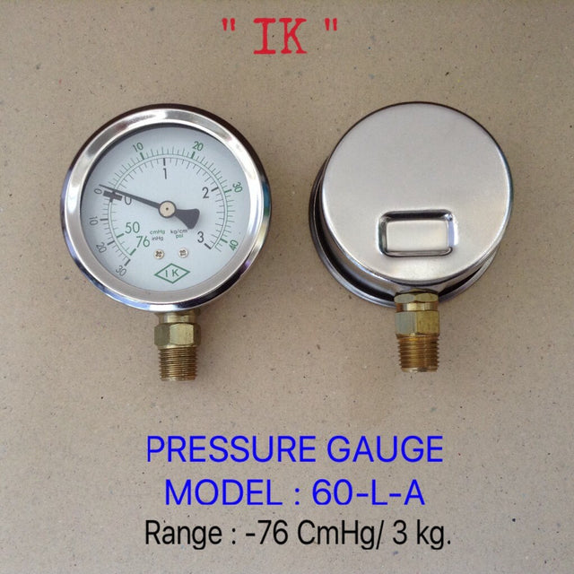 IK Pressure Gauges "IK" 2.5 นิ้ว -76 CMHG 3KG/ -30-40 PSI ออกล่าง 1/4" ทองเหลือง NPT