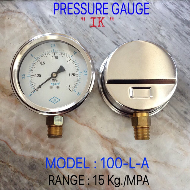 IK Pressure Gauges ''IK" 4 นิ้ว 0-1.5MPA/0-15KG ออกล่าง 1/2" ทองเหลือง NPT