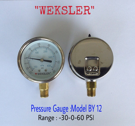 - Changwad Co.,Ltd. - WEKSLER Pressure Gauges "WEKSLER" 2.5 นิ้ว -100-400KPA/-30-60PSI ออกล่าง 1/4" ทองเหลือง NPT 935.00 ฿Unit price /Unavailable