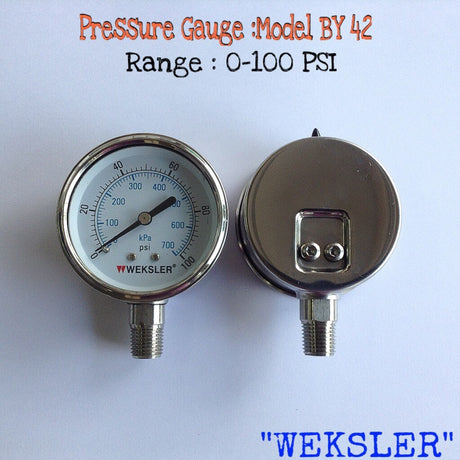 - Changwad Co.,Ltd. - WEKSLER Pressure Gauges "WEKSLER" 4 นิ้ว 0-100KPA/0-15PSI ออกล่าง 1/2" สแตนเลส NPT 3,179.00 ฿Unit price /Unavailable