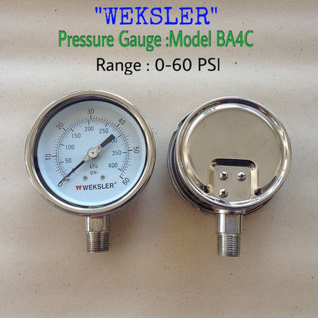 - Changwad Co.,Ltd. - WEKSLER Pressure Gauges "WEKSLER" 4 นิ้ว 0-400KPA/0-60PSI ออกล่าง 1/2" สแตนเลส NPT 3,179.00 ฿Unit price /Unavailable