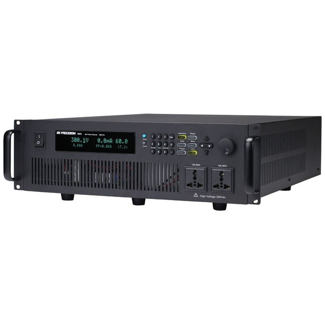BK Precision 9800 Series เป็นทั้งเครื่องกำเนิดไฟฟ้ากระแสสลับโปรแกรมได้และเป็นเครื่องวัดไฟฟ้าในตัว สามารถจ่ายกำลังไฟฟ้า AC แบบลิเนียร์ได้สูงสุด 1500 VA ผ่านทางขั้วต่อเอาต์พุตมาตรฐานที่หน้าปัดด้านหน้าและขั้วต่อด้านหลังเครื่อง โปรแกรมการปรับค่าแรงดันได้จาก 0 ถึง 300 V ความละเอียด 0.1 V ปรับความถี่ได้จาก 45 Hz ถึง 500 Hz ที่มุมเฟสตั้งแต่ 0 ถึง 360 องศา จอแสดงผล VFD สว่างชัดเจน แสดงค่า Vrms, Irms, Ipeak, frequency, power factor (PF), apparent power, true power และเวลาที่จ่ายเอาต์พุต (elapsed output time)