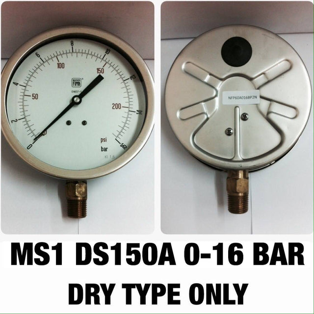 NUOVA FIMA Pressure Gauges 6 นิ้ว 0-16 BAR (200PSI) ออกล่าง เกลียว 1/2" NPT ทองเหลือง (แบบแห้ง)