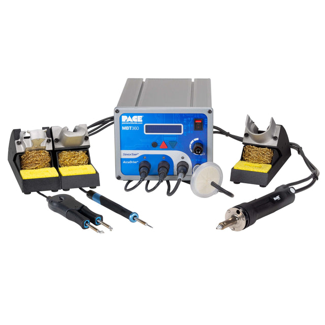MBT 360 เครืองบัดกรีและดูดตะกั่วแบบปรับอุณหภูมิระบบ Digital สามารถรองรับการใช้งานได้ 3 ด้านพร้อมกัน ในชุดจะประกอบไปด้วย ด้ามบัดกรี 1 ด้าม, ด้ามดูดตะกั่ว 1 ด้าม และด้ามปากคีบ 1 ด้าม ผสมผสานกันระหว่าง Two AccuDrive port และ One SensaTemp port